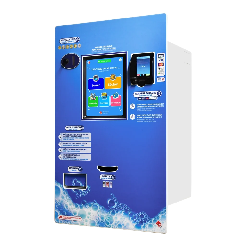 Elle accepte les paiements pièces, billets et carte bancaire, ainsi qu’un lecteur fidélité compatible MDB. Grâce à la gestion à distance, vous accédez aux transactions, remboursements et démarrage machine depuis votre smartphone.